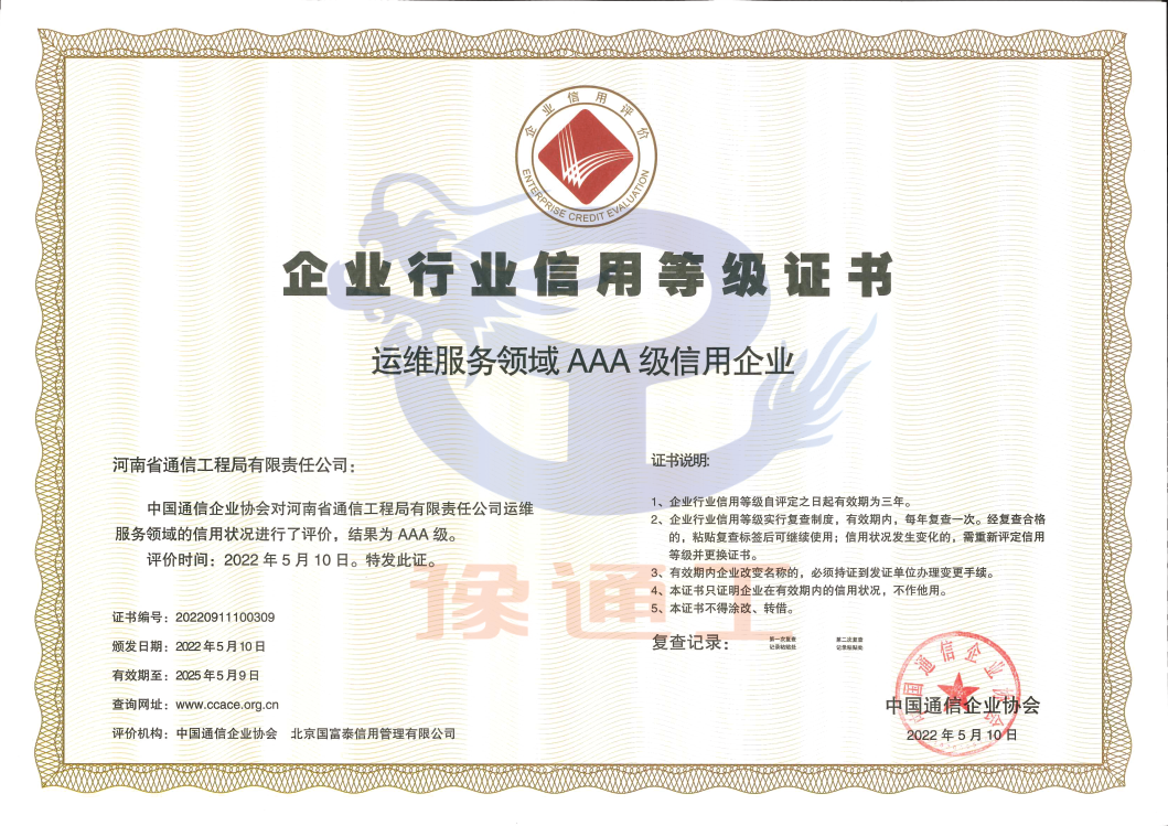 通信運維服務(wù)領(lǐng)域信用企業(yè)AAA級